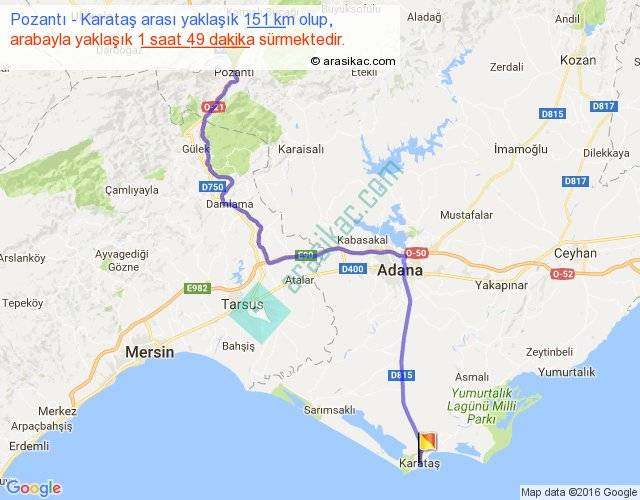 Pozantı - Karataş arası yaklaşık olarak 90 km/h ile yukarıda belirtilen sürede olup, iki yerin kuş uçuşu uzaklığı (mesafesi) 105'dir. Yolculuk otobüsle 2 saat 21 dakika sürmektedir.