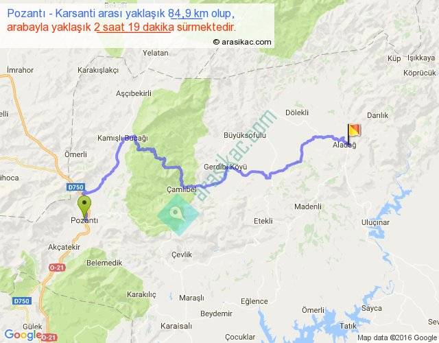 Pozantı - Karsanti arası yaklaşık olarak 90 km/h ile yukarıda belirtilen sürede olup, iki yerin kuş uçuşu uzaklığı (mesafesi) 48'dir. Yolculuk otobüsle 3 saat 0 dakika sürmektedir.