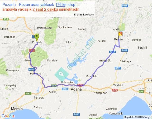 Pozantı - Kozan arası yaklaşık olarak 90 km/h ile yukarıda belirtilen sürede olup, iki yerin kuş uçuşu uzaklığı (mesafesi) 83'dir. Yolculuk otobüsle 2 saat 38 dakika sürmektedir.