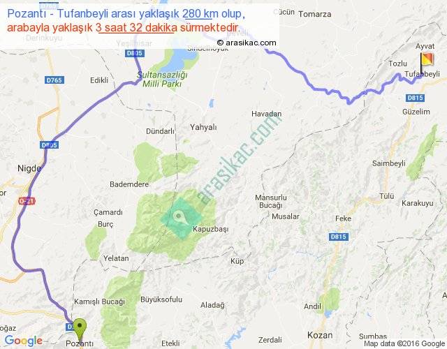 Pozantı - Tufanbeyli arası yaklaşık olarak 90 km/h ile yukarıda belirtilen sürede olup, iki yerin kuş uçuşu uzaklığı (mesafesi) 150'dir. Yolculuk otobüsle 4 saat 35 dakika sürmektedir.