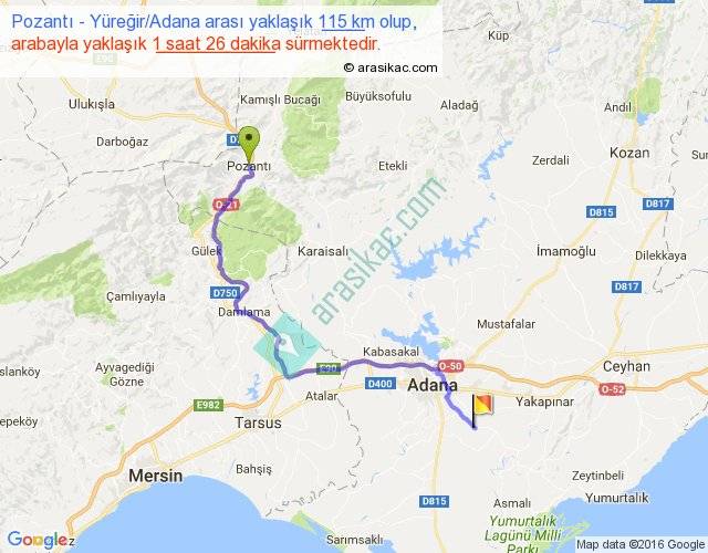Pozantı - Yüreğir Adana arası yaklaşık olarak 90 km/h ile yukarıda belirtilen sürede olup, iki yerin kuş uçuşu uzaklığı (mesafesi) 76'dir. Yolculuk otobüsle 1 saat 51 dakika sürmektedir.