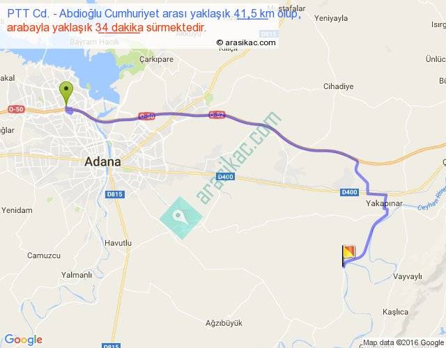 PTT Cd. - Abdioğlu Cumhuriyet arası yaklaşık olarak 90 km/h ile yukarıda belirtilen sürede olup, iki yerin kuş uçuşu uzaklığı (mesafesi) 28'dir. Yolculuk otobüsle 44 dakika sürmektedir.