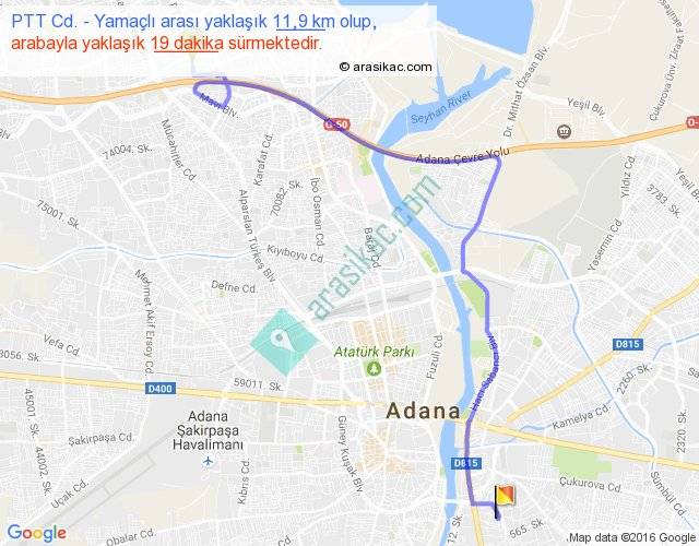 PTT Cd. - Yamaçlı arası yaklaşık olarak 90 km/h ile yukarıda belirtilen sürede olup, iki yerin kuş uçuşu uzaklığı (mesafesi) 8'dir. Yolculuk otobüsle 24 dakika sürmektedir.
