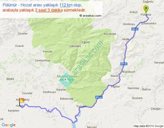 Pülümür - Hozat arası yaklaşık olarak 90 km/h ile yukarıda belirtilen sürede olup, iki yerin kuş uçuşu uzaklığı (mesafesi) 71'dir. Yolculuk otobüsle 2 saat 39 dakika sürmektedir.