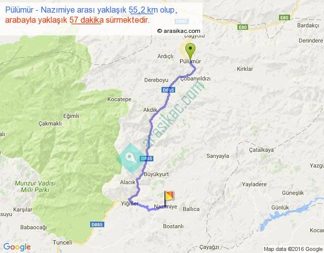 Pülümür - Nazımiye arası yaklaşık olarak 90 km/h ile yukarıda belirtilen sürede olup, iki yerin kuş uçuşu uzaklığı (mesafesi) 34'dir. Yolculuk otobüsle 1 saat 14 dakika sürmektedir.
