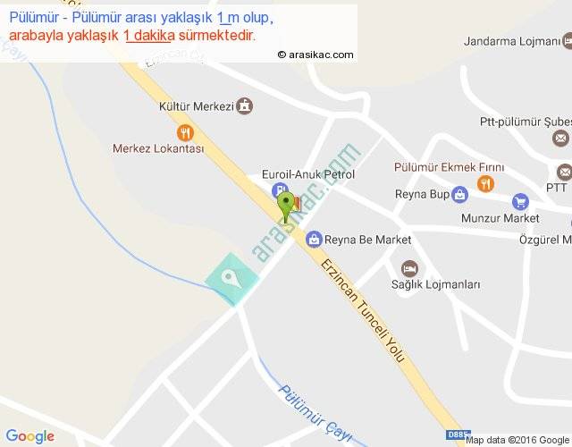Pülümür - Pülümür arası yaklaşık olarak 90 km/h ile yukarıda belirtilen sürede olup, iki yerin kuş uçuşu uzaklığı (mesafesi) 0'dir. Yolculuk otobüsle 1 dakika sürmektedir.