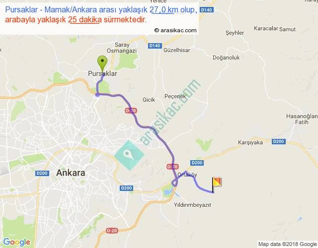 Pursaklar - Mamak Ankara arası yaklaşık olarak 90 km/h ile yukarıda belirtilen sürede olup, iki yerin kuş uçuşu uzaklığı (mesafesi) 19'dir. Yolculuk otobüsle 32 dakika sürmektedir.