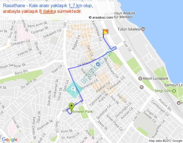 Rasathane - Kale arası yaklaşık olarak 90 km/h ile yukarıda belirtilen sürede olup, iki yerin kuş uçuşu uzaklığı (mesafesi) 1'dir. Yolculuk otobüsle 10 dakika sürmektedir.