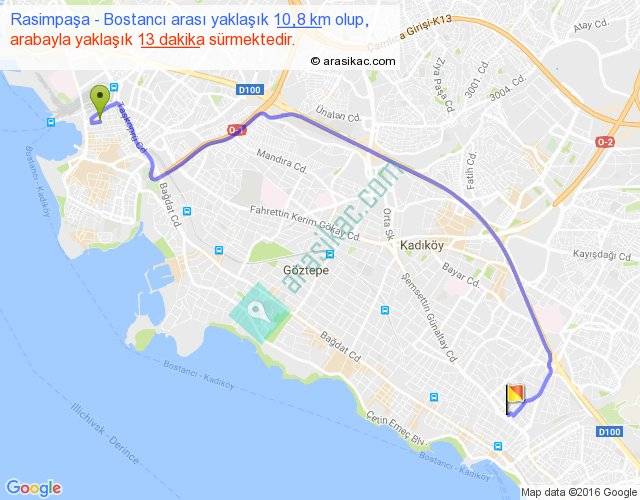 Rasimpaşa - Bostancı arası yaklaşık olarak 90 km/h ile yukarıda belirtilen sürede olup, iki yerin kuş uçuşu uzaklığı (mesafesi) 7'dir. Yolculuk otobüsle 16 dakika sürmektedir.