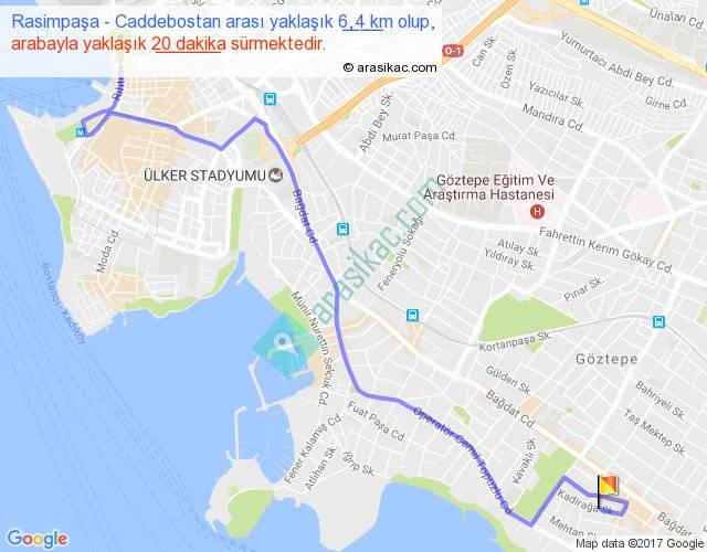 Rasimpaşa - Caddebostan arası yaklaşık olarak 90 km/h ile yukarıda belirtilen sürede olup, iki yerin kuş uçuşu uzaklığı (mesafesi) 4'dir. Yolculuk otobüsle 26 dakika sürmektedir.
