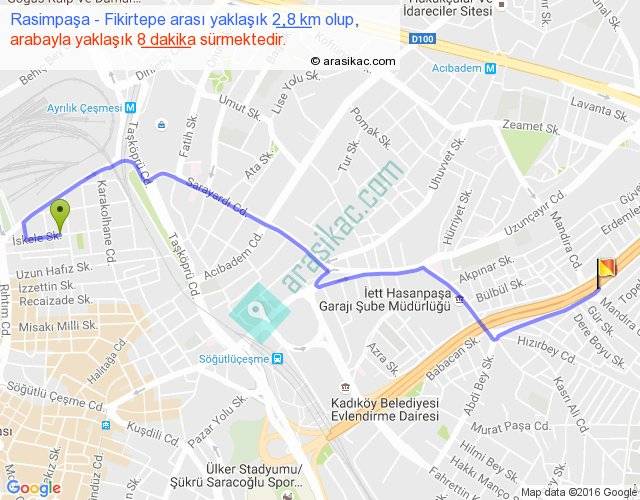 Rasimpaşa - Fikirtepe arası yaklaşık olarak 90 km/h ile yukarıda belirtilen sürede olup, iki yerin kuş uçuşu uzaklığı (mesafesi) 2'dir. Yolculuk otobüsle 10 dakika sürmektedir.