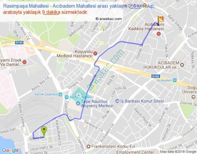Rasimpaşa Mahallesi - Acıbadem Mahallesi arası yaklaşık olarak 90 km/h ile yukarıda belirtilen sürede olup, iki yerin kuş uçuşu uzaklığı (mesafesi) 2'dir. Yolculuk otobüsle 11 dakika sürmektedir.