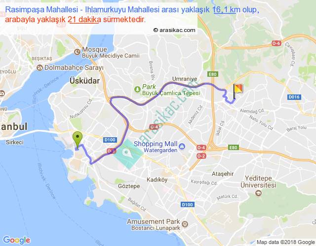 Eğer Rasimpaşa Mahallesi Ihlamurkuyu Mahallesi arası ne kadar yakar (benzin/mazot) diyorsanız, kilometrede 3 ₺ yakan bir aracınız var ise 48, km'de 4 ₺ yakan bir aracınız var ise 64, km'de 5 ₺ yakan bir aracınız var ise 80 ile bu yolculuğu tamamlayabilirsiniz.