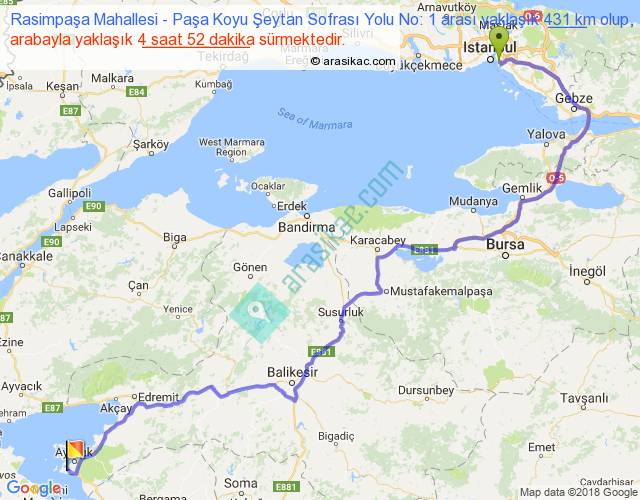 Rasimpaşa Mahallesi - Paşa Koyu Şeytan Sofrası Yolu No: 1 arası yaklaşık olarak 90 km/h ile yukarıda belirtilen sürede olup, iki yerin kuş uçuşu uzaklığı (mesafesi) 276'dir. Eğer belirtilen yerler arasında uçak seferi var ise bu süre uçakla 25 dakika'ya kadar düşebilir. Yolculuk otobüsle 6 saat 19 dakika sürmektedir.