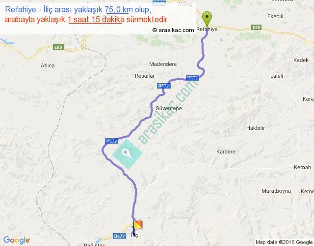 Refahiye - İliç arası yaklaşık olarak 90 km/h ile yukarıda belirtilen sürede olup, iki yerin kuş uçuşu uzaklığı (mesafesi) 52'dir. Yolculuk otobüsle 1 saat 37 dakika sürmektedir.