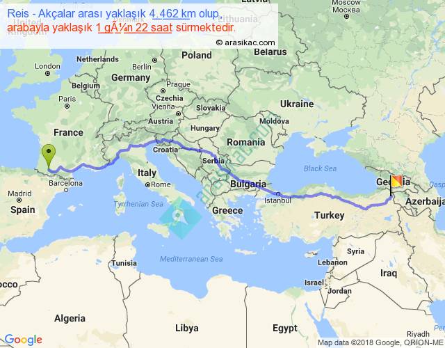 Reis - Akçalar arası yaklaşık olarak 90 km/h ile yukarıda belirtilen sürede olup, iki yerin kuş uçuşu uzaklığı (mesafesi) 3528'dir. Eğer belirtilen yerler arasında uçak seferi var ise bu süre uçakla 5 saat 25 dakika'ya kadar düşebilir. Yolculuk otobüsle 2 gün 11 saat sürmektedir.