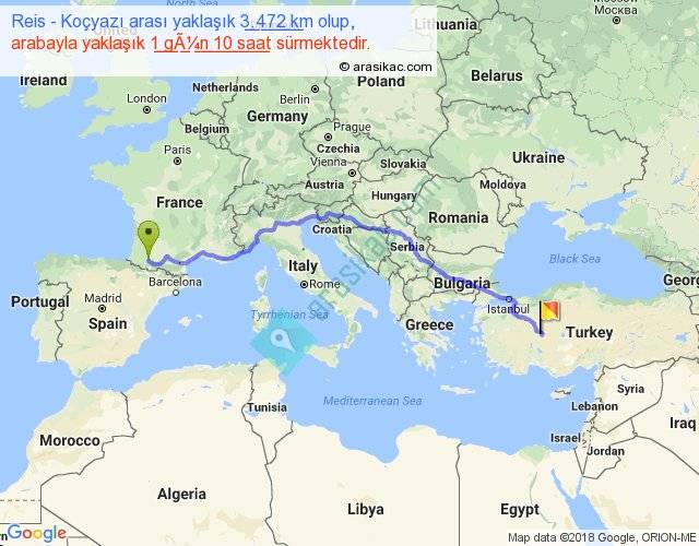Reis - Koçyazı arası yaklaşık olarak 90 km/h ile yukarıda belirtilen sürede olup, iki yerin kuş uçuşu uzaklığı (mesafesi) 2669'dir. Eğer belirtilen yerler arasında uçak seferi var ise bu süre uçakla 4 saat 06 dakika'ya kadar düşebilir. Yolculuk otobüsle 1 gün 20 saat sürmektedir.
