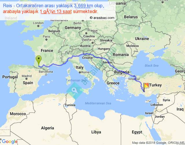 Reis - Ortakaraören arası yaklaşık olarak 90 km/h ile yukarıda belirtilen sürede olup, iki yerin kuş uçuşu uzaklığı (mesafesi) 2766'dir. Eğer belirtilen yerler arasında uçak seferi var ise bu süre uçakla 4 saat 15 dakika'ya kadar düşebilir. Yolculuk otobüsle 2 gün 0 saat sürmektedir.