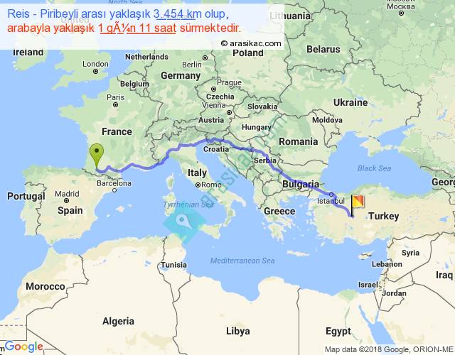 Reis - Piribeyli arası yaklaşık olarak 90 km/h ile yukarıda belirtilen sürede olup, iki yerin kuş uçuşu uzaklığı (mesafesi) 2665'dir. Eğer belirtilen yerler arasında uçak seferi var ise bu süre uçakla 4 saat 05 dakika'ya kadar düşebilir. Yolculuk otobüsle 1 gün 21 saat sürmektedir.