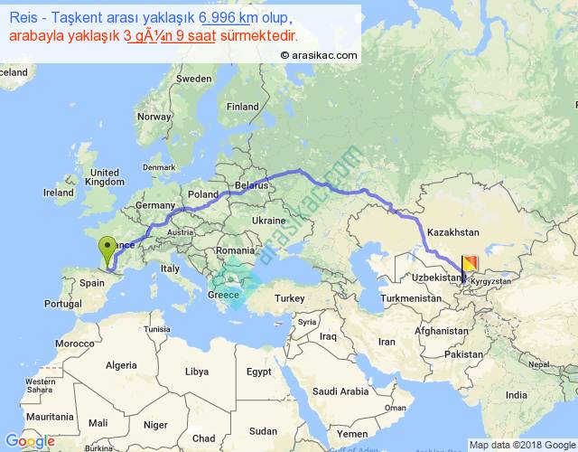 Reis - Taşkent arası yaklaşık olarak 90 km/h ile yukarıda belirtilen sürede olup, iki yerin kuş uçuşu uzaklığı (mesafesi) 5499'dir. Eğer belirtilen yerler arasında uçak seferi var ise bu süre uçakla 8 saat 27 dakika'ya kadar düşebilir. Yolculuk otobüsle 4 gün 9 saat sürmektedir.