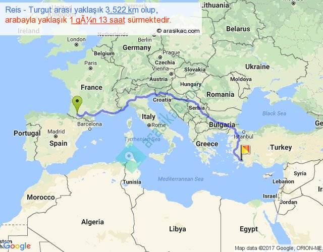 Reis - Turgut arası yaklaşık olarak 90 km/h ile yukarıda belirtilen sürede olup, iki yerin kuş uçuşu uzaklığı (mesafesi) 2503'dir. Eğer belirtilen yerler arasında uçak seferi var ise bu süre uçakla 3 saat 51 dakika'ya kadar düşebilir. Yolculuk otobüsle 2 gün 0 saat sürmektedir.