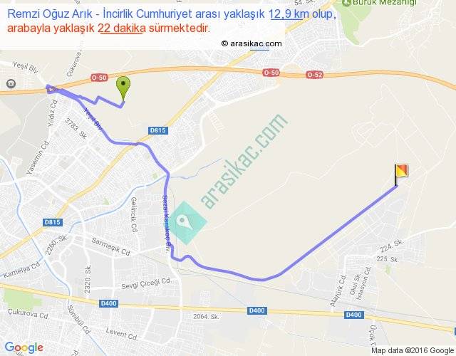 Remzi Oğuz Arık - İncirlik Cumhuriyet arası yaklaşık olarak 90 km/h ile yukarıda belirtilen sürede olup, iki yerin kuş uçuşu uzaklığı (mesafesi) 6'dir. Yolculuk otobüsle 28 dakika sürmektedir.