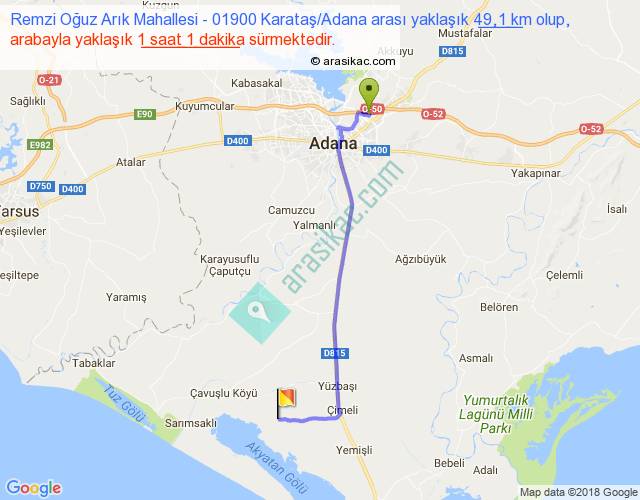 Remzi Oğuz Arık Mahallesi - 01900 Karataş Adana arası yaklaşık olarak 90 km/h ile yukarıda belirtilen sürede olup, iki yerin kuş uçuşu uzaklığı (mesafesi) 39'dir. Yolculuk otobüsle 1 saat 19 dakika sürmektedir.