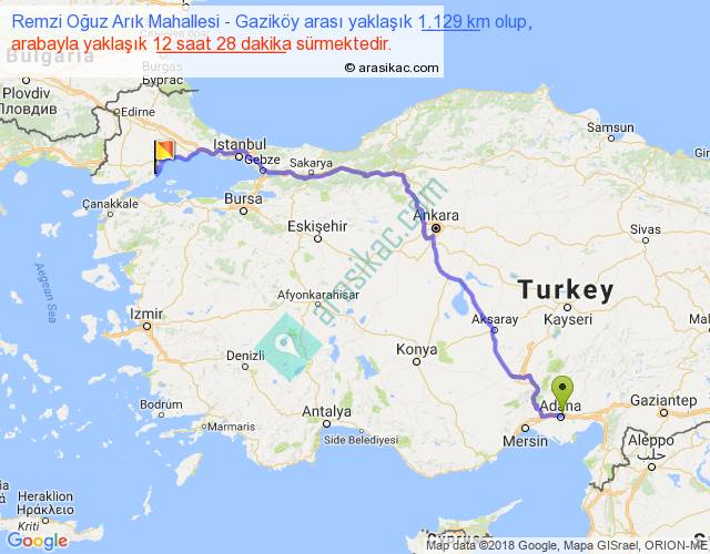 Remzi Oğuz Arık Mahallesi - Gaziköy arası yaklaşık olarak 90 km/h ile yukarıda belirtilen sürede olup, iki yerin kuş uçuşu uzaklığı (mesafesi) 805'dir. Eğer belirtilen yerler arasında uçak seferi var ise bu süre uçakla 1 saat 14 dakika'ya kadar düşebilir. Yolculuk otobüsle 16 saat 12 dakika sürmektedir.
