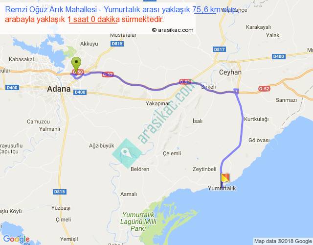 Remzi Oğuz Arık Mahallesi - Yumurtalık arası yaklaşık olarak 90 km/h ile yukarıda belirtilen sürede olup, iki yerin kuş uçuşu uzaklığı (mesafesi) 46'dir. Yolculuk otobüsle 1 saat 18 dakika sürmektedir.