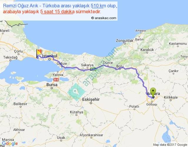Remzi Oğuz Arık - Türkoba arası yaklaşık olarak 90 km/h ile yukarıda belirtilen sürede olup, iki yerin kuş uçuşu uzaklığı (mesafesi) 386'dir. Eğer belirtilen yerler arasında uçak seferi var ise bu süre uçakla 35 dakika'ya kadar düşebilir. Yolculuk otobüsle 6 saat 49 dakika sürmektedir.