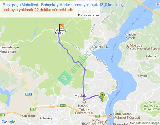 Reşitpaşa Mahallesi - Bahçeköy Merkez arası yaklaşık olarak 90 km/h ile yukarıda belirtilen sürede olup, iki yerin kuş uçuşu uzaklığı (mesafesi) 9'dir. Yolculuk otobüsle 28 dakika sürmektedir.