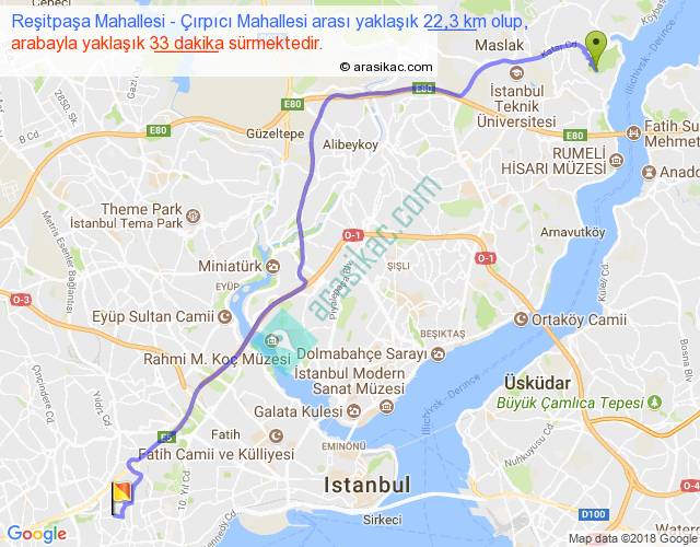 Reşitpaşa Mahallesi - Çırpıcı Mahallesi arası yaklaşık olarak 90 km/h ile yukarıda belirtilen sürede olup, iki yerin kuş uçuşu uzaklığı (mesafesi) 17'dir. Yolculuk otobüsle 42 dakika sürmektedir.