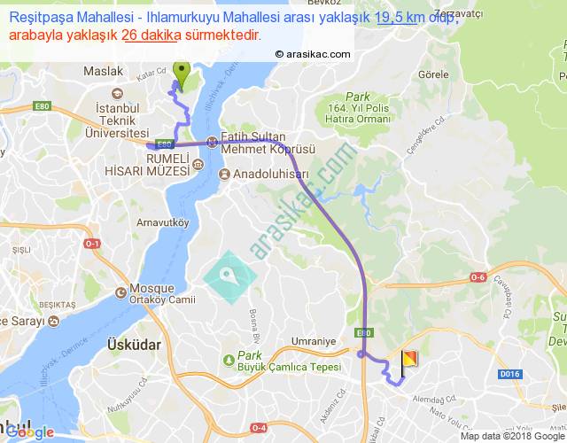 Reşitpaşa Mahallesi - Ihlamurkuyu Mahallesi arası yaklaşık olarak 90 km/h ile yukarıda belirtilen sürede olup, iki yerin kuş uçuşu uzaklığı (mesafesi) 12'dir. Yolculuk otobüsle 33 dakika sürmektedir.