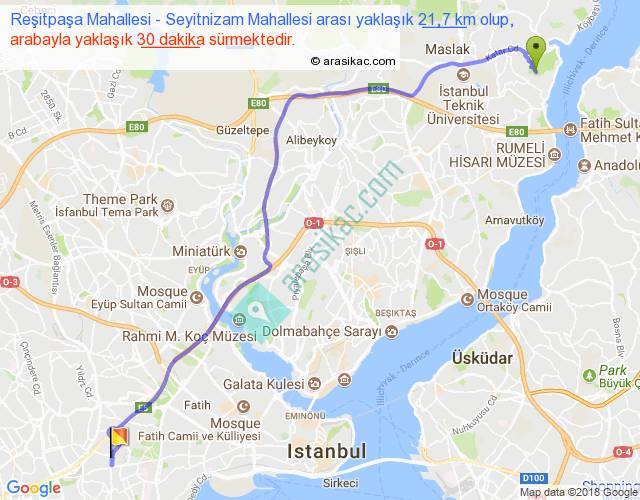 Reşitpaşa Mahallesi - Seyitnizam Mahallesi arası yaklaşık olarak 90 km/h ile yukarıda belirtilen sürede olup, iki yerin kuş uçuşu uzaklığı (mesafesi) 16'dir. Yolculuk otobüsle 39 dakika sürmektedir.