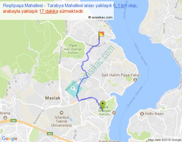 Eğer Reşitpaşa Mahallesi Tarabya Mahallesi arası ne kadar yakar (benzin/mazot) diyorsanız, kilometrede 3 ₺ yakan bir aracınız var ise 18, km'de 4 ₺ yakan bir aracınız var ise 24, km'de 5 ₺ yakan bir aracınız var ise 30 ile bu yolculuğu tamamlayabilirsiniz.