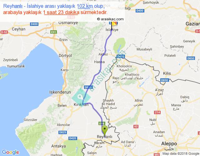 Reyhanlı - İslahiye arası yaklaşık olarak 90 km/h ile yukarıda belirtilen sürede olup, iki yerin kuş uçuşu uzaklığı (mesafesi) 84'dir. Yolculuk otobüsle 1 saat 47 dakika sürmektedir.