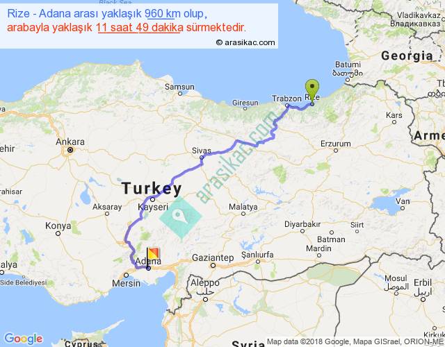 Rize - Adana arası yaklaşık olarak 90 km/h ile yukarıda belirtilen sürede olup, iki yerin kuş uçuşu uzaklığı (mesafesi) 630'dir. Eğer belirtilen yerler arasında uçak seferi var ise bu süre uçakla 58 dakika'ya kadar düşebilir. Yolculuk otobüsle 14 saat 47 dakika sürmektedir.