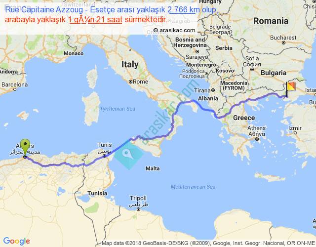 Rue Capitaine Azzoug - Esetçe arası yaklaşık olarak 90 km/h ile yukarıda belirtilen sürede olup, iki yerin kuş uçuşu uzaklığı (mesafesi) 2055'dir. Eğer belirtilen yerler arasında uçak seferi var ise bu süre uçakla 3 saat 09 dakika'ya kadar düşebilir. Yolculuk otobüsle 2 gün 10 saat sürmektedir.