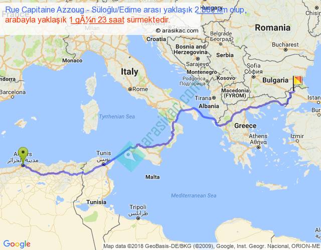 Rue Capitaine Azzoug - Süloğlu Edirne arası yaklaşık olarak 90 km/h ile yukarıda belirtilen sürede olup, iki yerin kuş uçuşu uzaklığı (mesafesi) 2101'dir. Eğer belirtilen yerler arasında uçak seferi var ise bu süre uçakla 3 saat 13 dakika'ya kadar düşebilir. Yolculuk otobüsle 2 gün 13 saat sürmektedir.