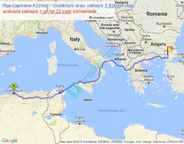 Rue Capitaine Azzoug - Uzunköprü arası yaklaşık olarak 90 km/h ile yukarıda belirtilen sürede olup, iki yerin kuş uçuşu uzaklığı (mesafesi) 2079'dir. Eğer belirtilen yerler arasında uçak seferi var ise bu süre uçakla 3 saat 11 dakika'ya kadar düşebilir. Yolculuk otobüsle 2 gün 11 saat sürmektedir.