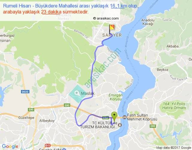 Rumeli Hisarı - Büyükdere Mahallesi arası yaklaşık olarak 90 km/h ile yukarıda belirtilen sürede olup, iki yerin kuş uçuşu uzaklığı (mesafesi) 8'dir. Yolculuk otobüsle 29 dakika sürmektedir.