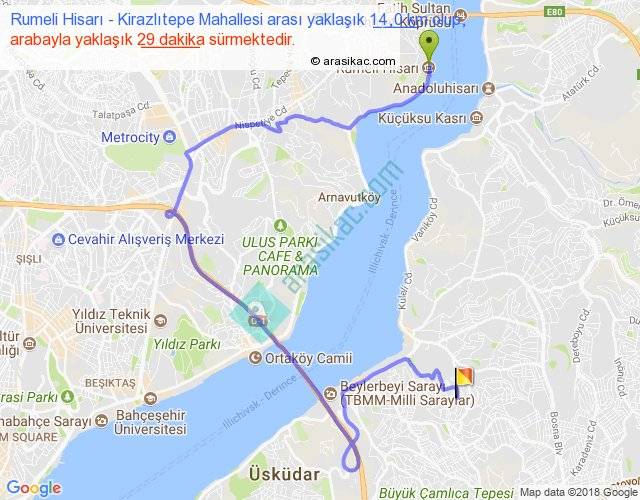 Rumeli Hisarı - Kirazlıtepe Mahallesi arası yaklaşık olarak 90 km/h ile yukarıda belirtilen sürede olup, iki yerin kuş uçuşu uzaklığı (mesafesi) 5'dir. Yolculuk otobüsle 37 dakika sürmektedir.