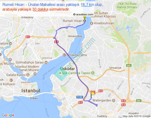 Rumeli Hisarı - Ünalan Mahallesi arası yaklaşık olarak 90 km/h ile yukarıda belirtilen sürede olup, iki yerin kuş uçuşu uzaklığı (mesafesi) 9'dir. Yolculuk otobüsle 39 dakika sürmektedir.