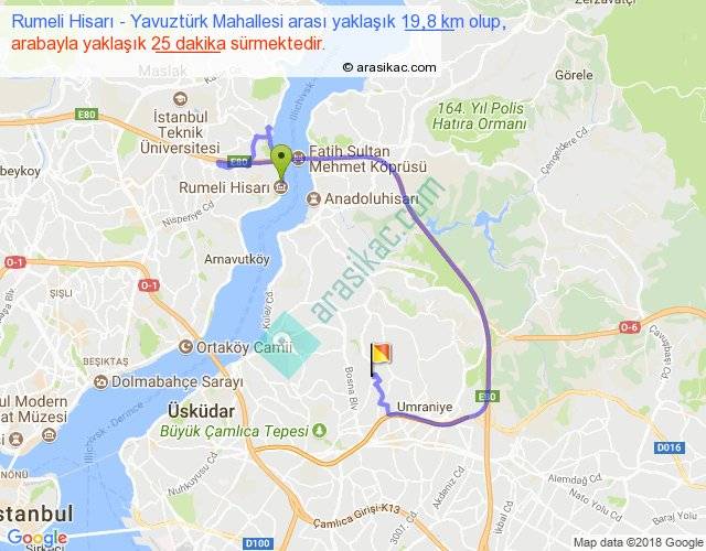Rumeli Hisarı - Yavuztürk Mahallesi arası yaklaşık olarak 90 km/h ile yukarıda belirtilen sürede olup, iki yerin kuş uçuşu uzaklığı (mesafesi) 6'dir. Yolculuk otobüsle 32 dakika sürmektedir.