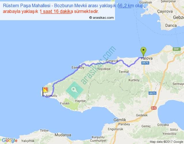 Rüstem Paşa Mahallesi - Bozburun Mevkii arası yaklaşık olarak 90 km/h ile yukarıda belirtilen sürede olup, iki yerin kuş uçuşu uzaklığı (mesafesi) 43'dir. Yolculuk otobüsle 1 saat 38 dakika sürmektedir.