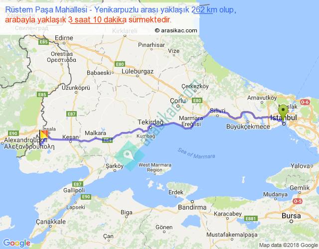 Rüstem Paşa Mahallesi - Yenikarpuzlu arası yaklaşık olarak 90 km/h ile yukarıda belirtilen sürede olup, iki yerin kuş uçuşu uzaklığı (mesafesi) 225'dir. Yolculuk otobüsle 4 saat 7 dakika sürmektedir.