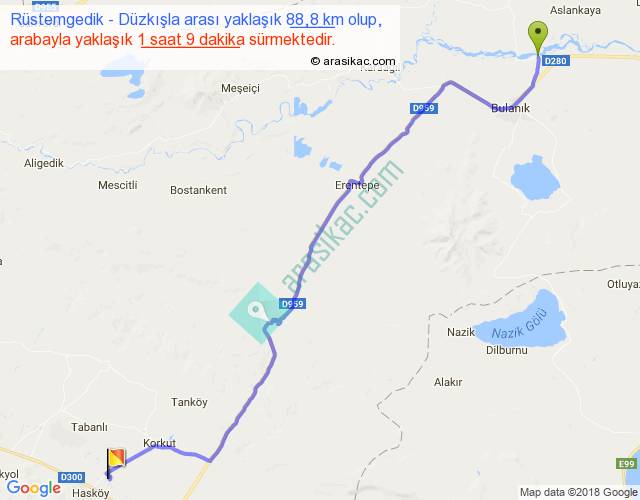Rüstemgedik - Düzkışla arası yaklaşık olarak 90 km/h ile yukarıda belirtilen sürede olup, iki yerin kuş uçuşu uzaklığı (mesafesi) 71'dir. Yolculuk otobüsle 1 saat 29 dakika sürmektedir.
