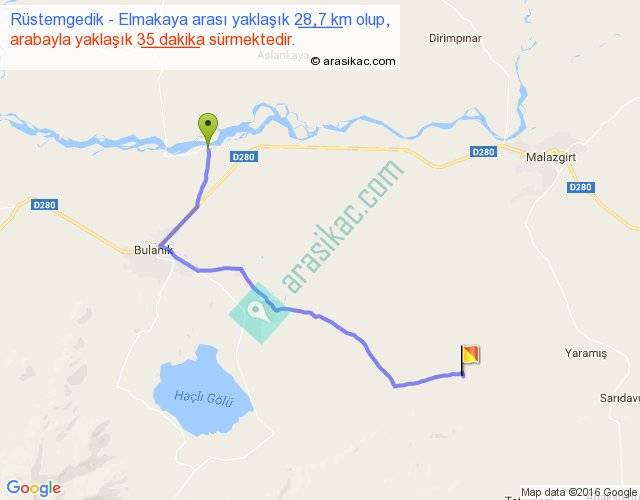 Rüstemgedik - Elmakaya arası yaklaşık olarak 90 km/h ile yukarıda belirtilen sürede olup, iki yerin kuş uçuşu uzaklığı (mesafesi) 20'dir. Yolculuk otobüsle 45 dakika sürmektedir.