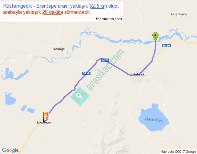 Rüstemgedik - Erentepe arası yaklaşık olarak 90 km/h ile yukarıda belirtilen sürede olup, iki yerin kuş uçuşu uzaklığı (mesafesi) 26'dir. Yolculuk otobüsle 36 dakika sürmektedir.