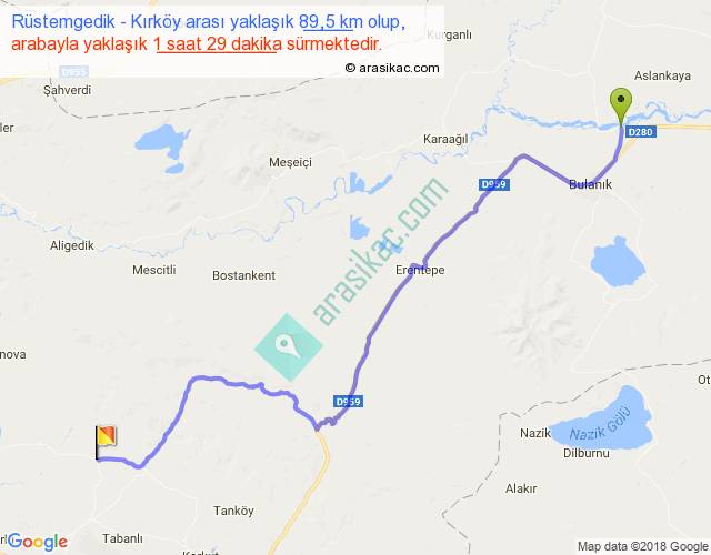 Rüstemgedik - Kırköy arası yaklaşık olarak 90 km/h ile yukarıda belirtilen sürede olup, iki yerin kuş uçuşu uzaklığı (mesafesi) 66'dir. Yolculuk otobüsle 1 saat 55 dakika sürmektedir.